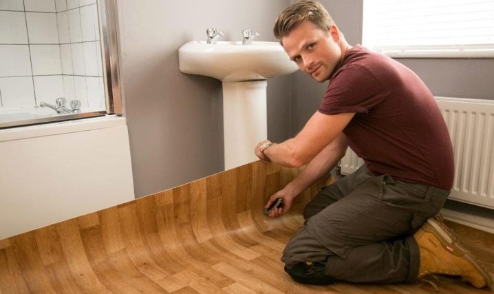 Besonderes Augenmerk muss auf die richtige Installation des Materials im Badezimmer gelegt werden. Die Hauptaufgabe - das Eindringen von Feuchtigkeit unter dem Linoleum zu verhindern. Bevor Sie mit der Installation fortfahren, müssen Sie die veraltete Beschichtung entfernen. Ggf. Nivellierung der Basis.