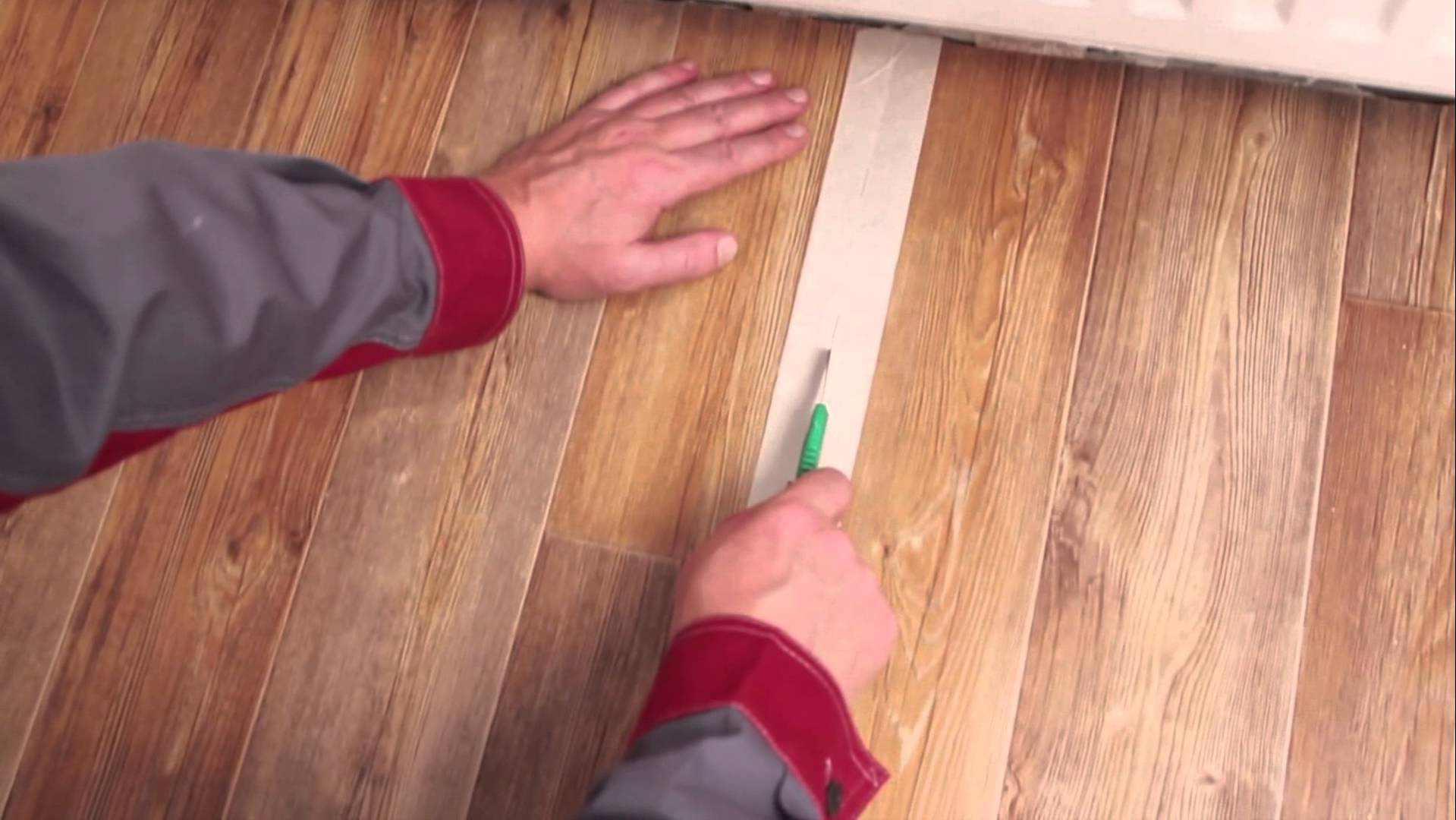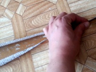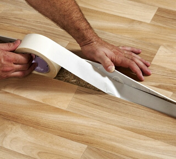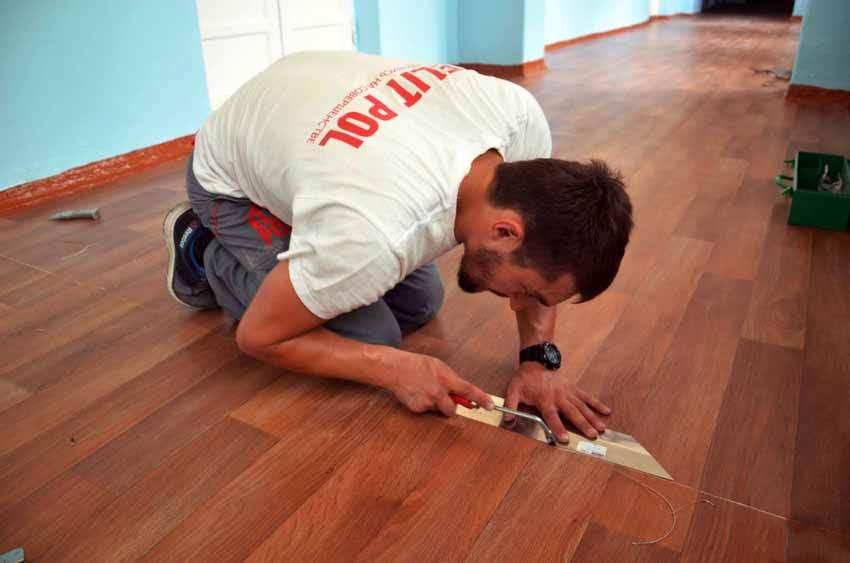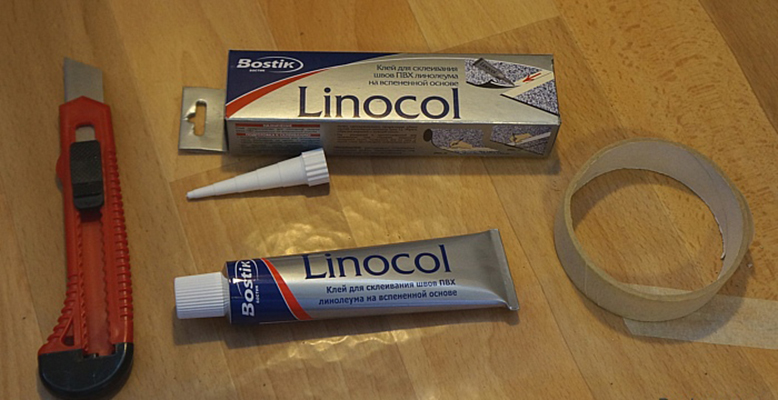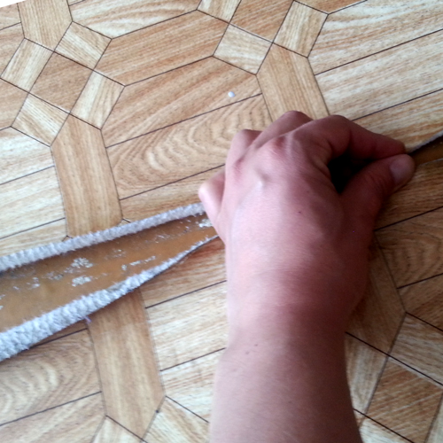 - Linoleum wird mit PVA-Leim oder PTFE-Band fest am Boden befestigt und die Kanten werden angepasst. Staub, Wasser und Schmutz werden vorentfernt;