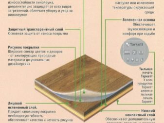 Die Aufteilung von Linoleum in Typen hängt vom Material der Herstellung, der Verschleißfestigkeit und der Struktur ab.