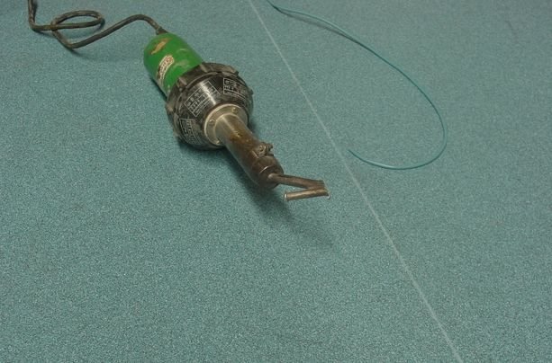 - Kanten entfetten für besseren Halt. Sie führen einen Fön durch die Kreuzung, nicht an einem Ort verweilen. Es ist notwendig, über die gesamte Länge gleichmäßig zu löten. Das Polymer sollte etwas über die Naht hinausragen. Die abgekühlte Naht wird über die gesamte Länge durch ein bogenförmiges Messer abgeschnitten (die Naht sollte warm sein, aber bereits festgeklemmt sein). Löten ist bequemer von der Wand zur Mitte des Raumes und auch von der gegenüberliegenden Seite.