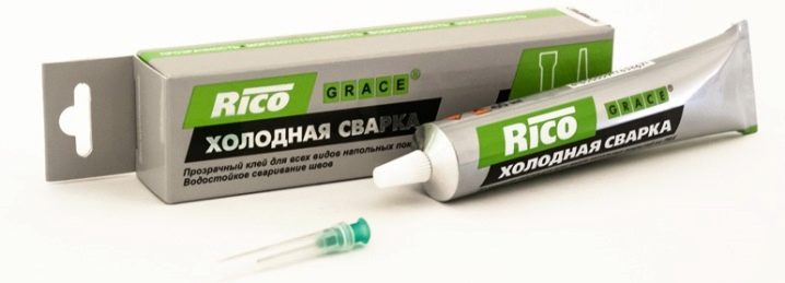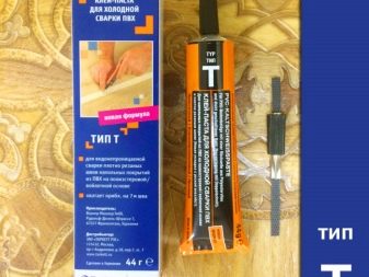Um die alte Leinwand wiederherzustellen, das Loch zu verschließen und das gerissene Linoleum zu verkleben, genügt es, kalt zu schweißen. Dazu gehören spezielle Arten von Leim, die nicht kleben, sondern die Enden der Lücke verschmelzen. Es gibt verschiedene Arten von Schweißungen: für unlinierte Linoleumstöße (Klasse A), für Filz (Klasse T) und für die Reparatur von großen Böen mit einem Spalt von 4 mm (Klasse C).