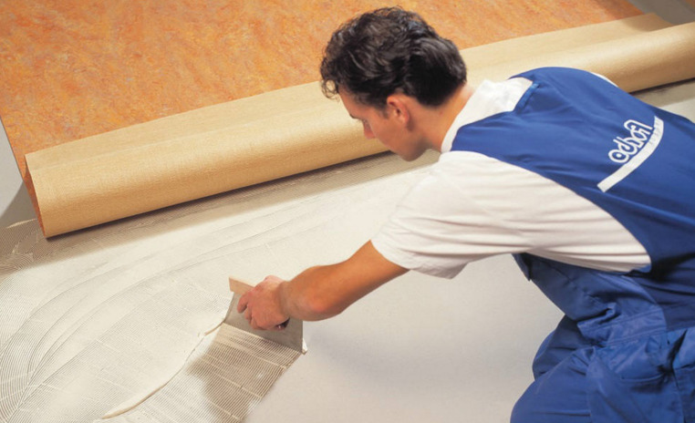 Natürliches Linoleum und Marmoleum wird nur auf Dispersionsklebstoff geklebt. Mastic ist besser zu wählen, wenn die Basis sehr nass ist oder du leitfähiges Linoleum legst. Bewertungen von Meistern sagen, dass für das Haus es busilate oder Acrylat genug ist.