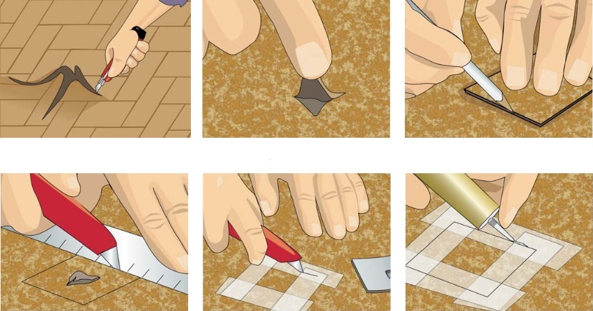 Um die Verbrennung zu reparieren, müssen Sie an ihrer Stelle ein Stück des gleichen Linoleums machen, das aus den Resten herausgeschnitten wird. Der Patch wird auf den Mastix geklebt, die Fugen werden durch Kaltverschweißen bearbeitet, der Patch wird für einen Tag unter die Last gelegt.