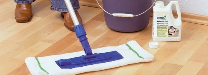 Dann wird das Produkt in einem Verhältnis von 1 Kappe zu 2 Liter Wasser verdünnt und die gesamte Oberfläche des Bodens damit gewaschen. Es benutzt keinen Mopp, es ist am besten, es manuell mit einem Mikrofasertuch zu machen, sich an schwer zugänglichen Stellen mit einem Schwamm mit einem weichen Strahlmittel zu helfen.