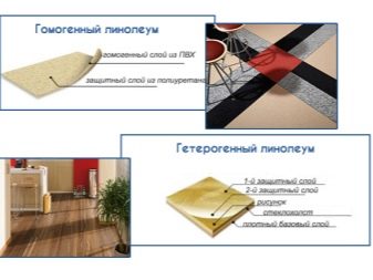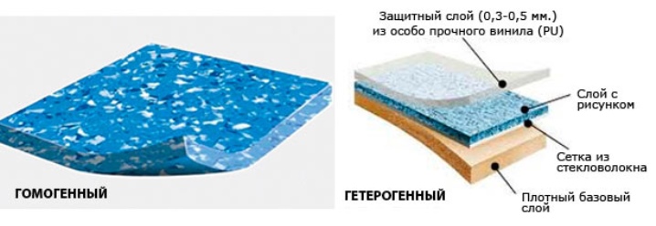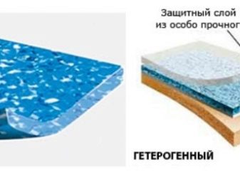 Jeder Typ hat seine eigenen Eigenschaften und ist für eine bestimmte Art von Raum konzipiert. Der Bodenbelag der semi-kommerziellen Klasse ist in zwei Typen unterteilt: heterogene (mehrschichtige) und homogene Art.