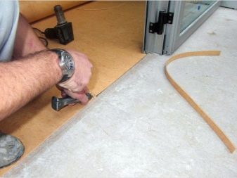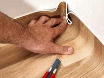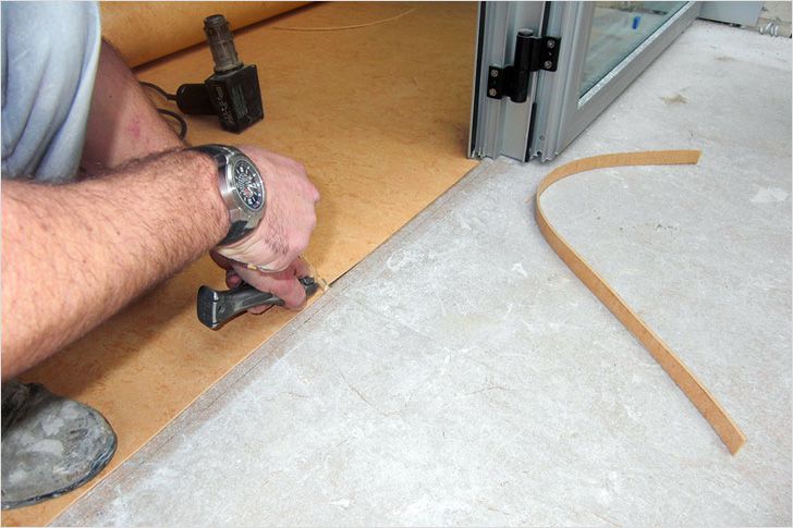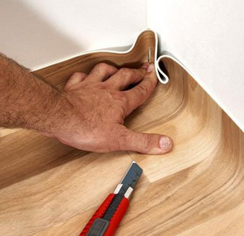 Die Anpassung erfolgt unter Berücksichtigung der Musterrichtung: Das Linoleum wird mit einem Aufdruck ausgelegt und an die Eigenschaften des Bodens angepasst, wobei das überschüssige Material mit einem Messer abgeschnitten wird.Wenn die Wände glatt sind, reicht es, 0,5 cm an den Rändern zu lassen.