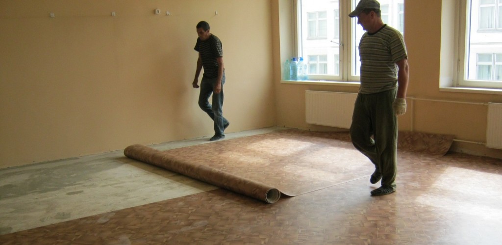 Masters glauben, dass in Fällen, in denen die Grundfläche 20 Quadratmeter überschreitet. m, Linoleum ist besser an der Basis zu bleiben. Das Verfahren besteht darin, eine spezielle Lösung aufzutragen und die Oberfläche von Linoleum mit schweren Möbeln zu zerkleinern.
