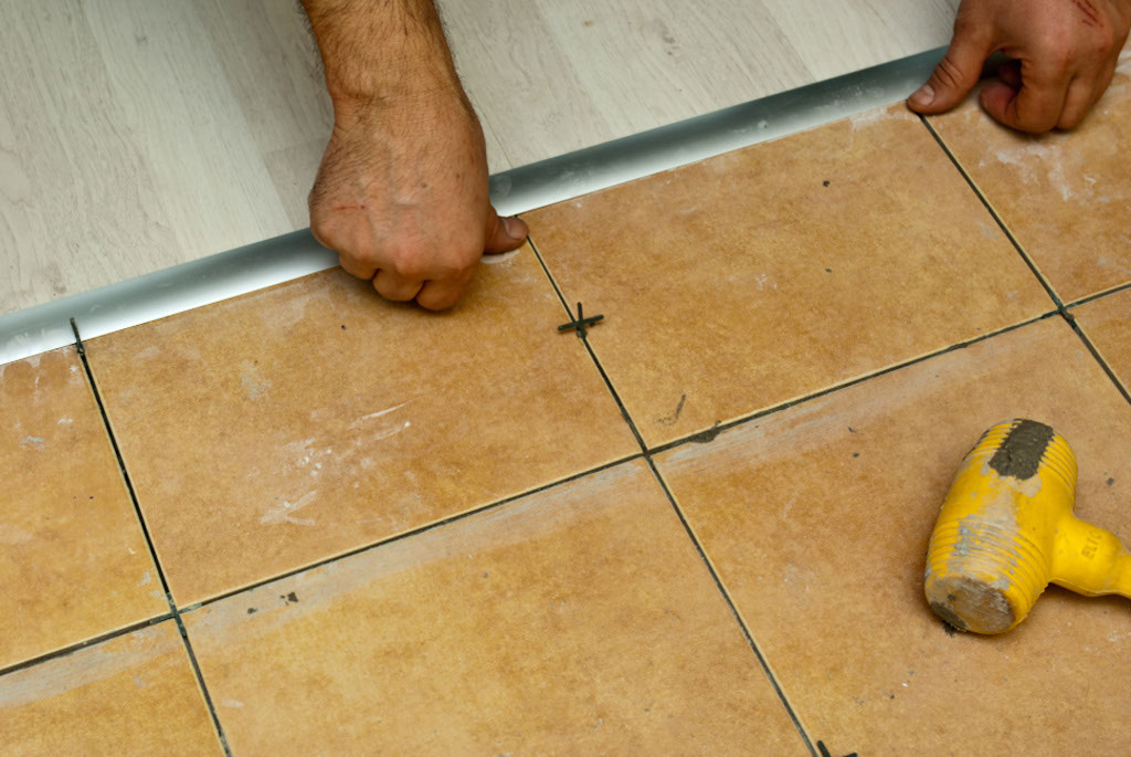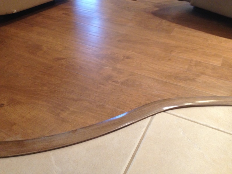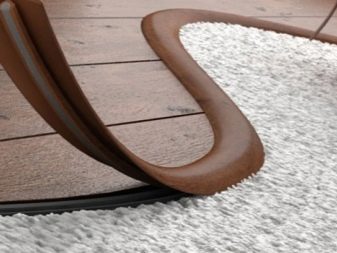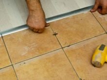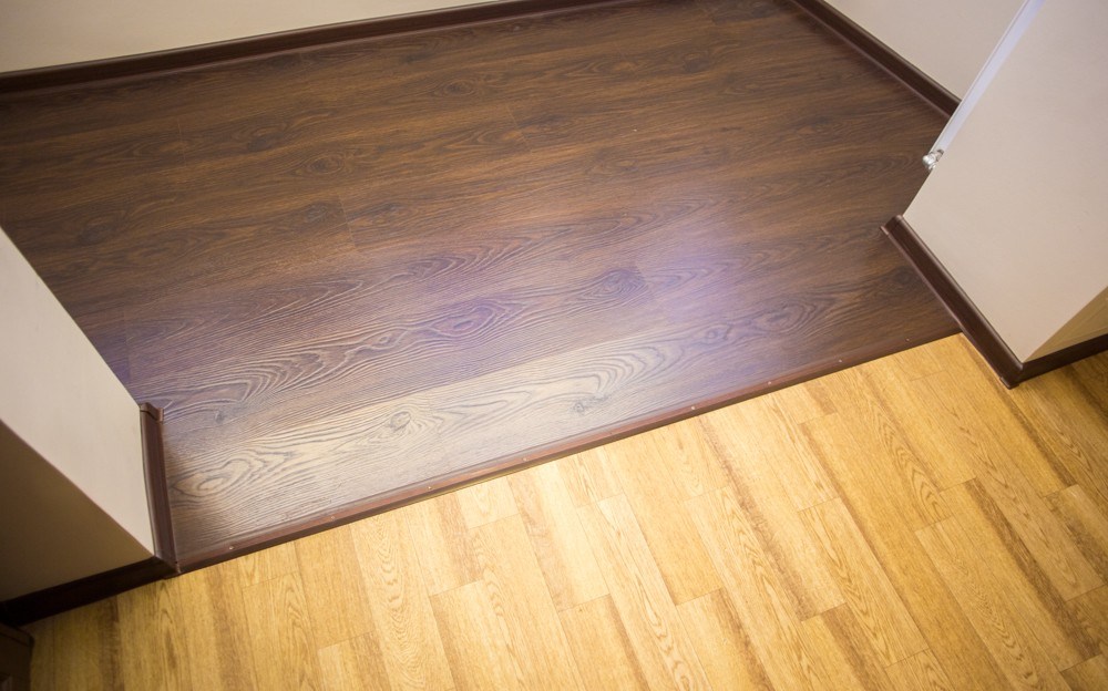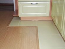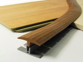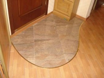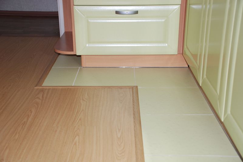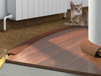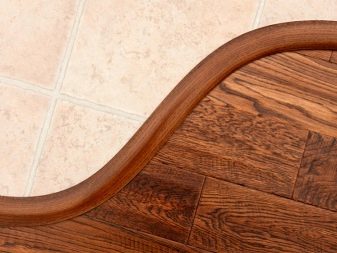 Bodenfliesen und Linoleum können in Form von geschwungenen Linien verbunden werden. In diesem Fall ist es besser, Korkschwellen zu verwenden, da sie beim Verlegen und Drehen der selbstschneidenden Schrauben schrumpft und fast vollständig in die Oberfläche übergeht und diese ausrichtet.