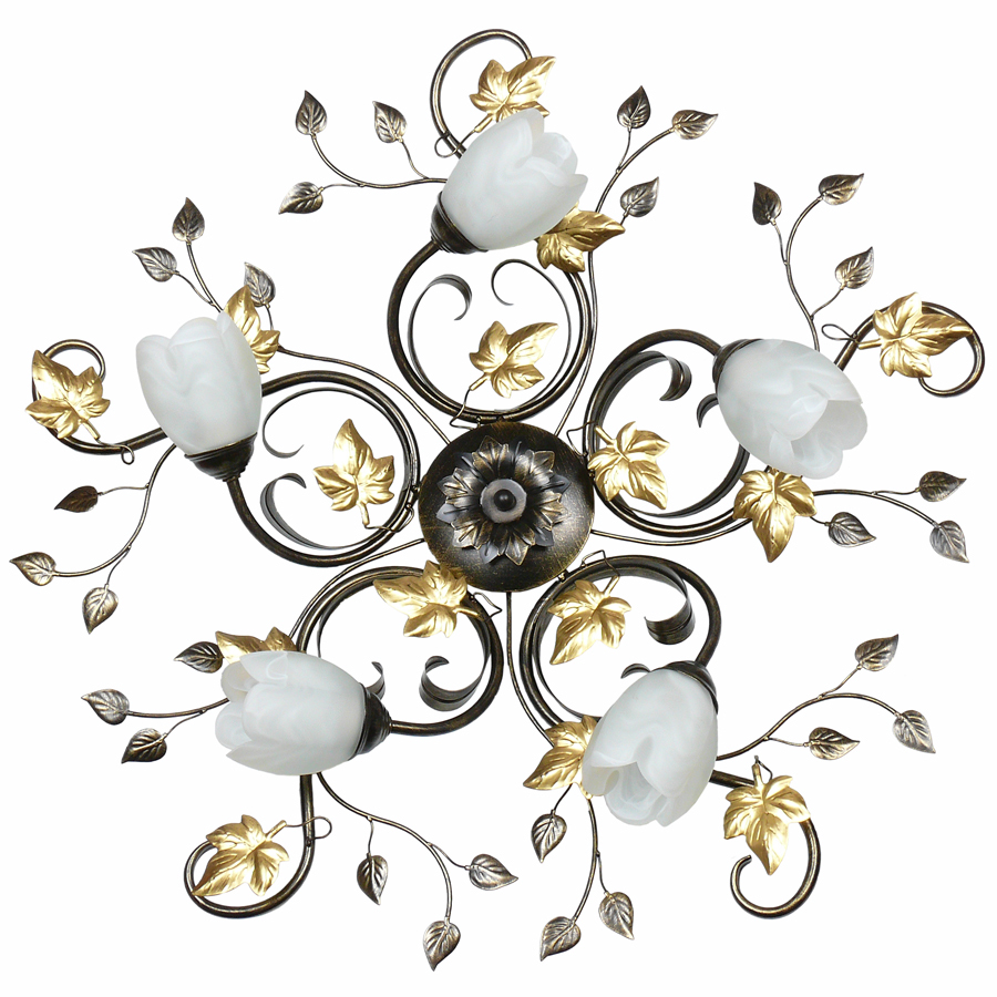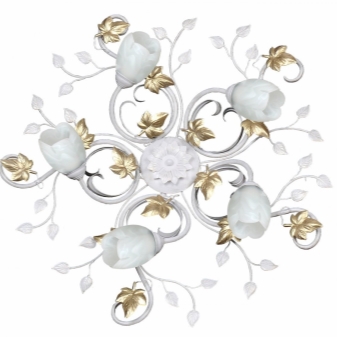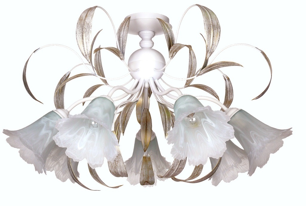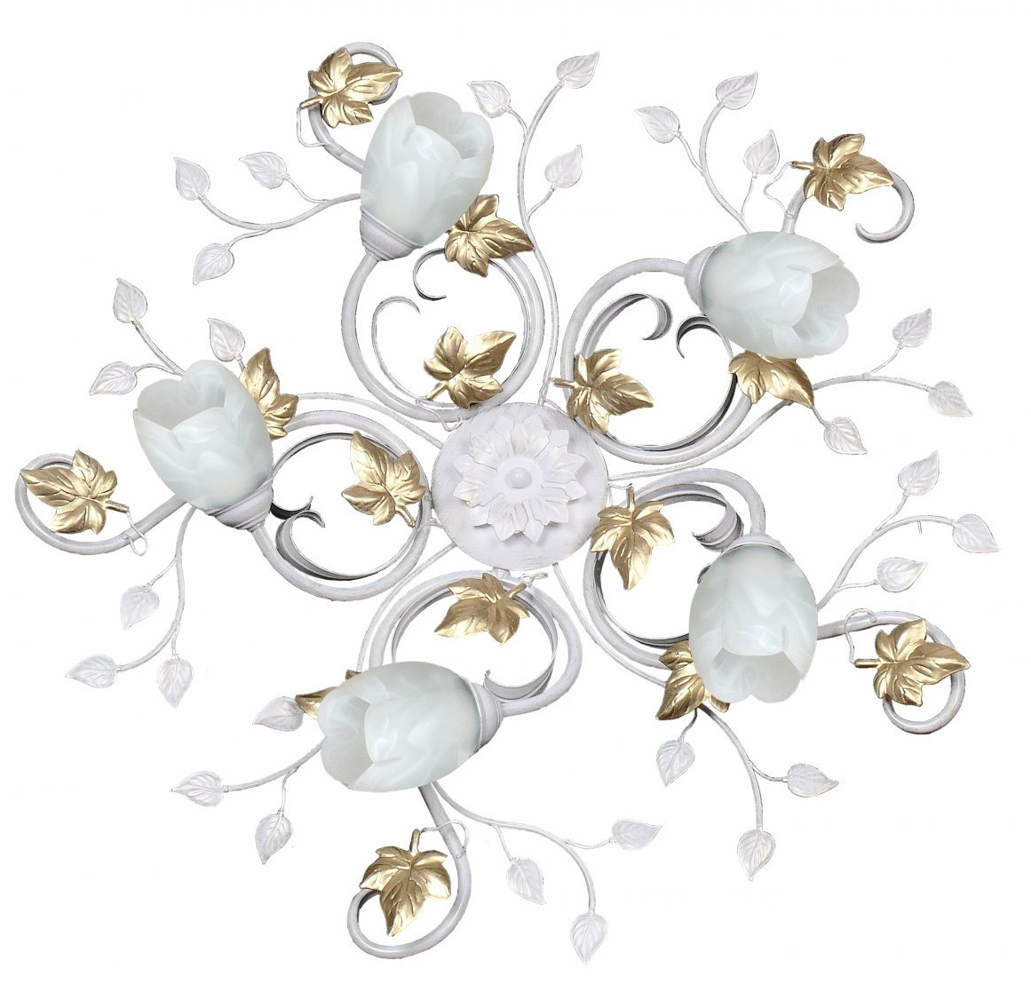 Decke "Florenz 10115-5C" Es ist eine originelle und sehr romantische Lampe. Die Kombination aus Weiß und Gold verleiht dem Produkt Zartheit, Leichtigkeit und Luftigkeit. Ein florales Dekor spricht vom außergewöhnlichen Geschmack des Vermieters. Metallarmaturen werden in weißer Farbe, sowie Glasdeckenlampen hergestellt.
