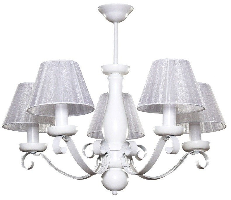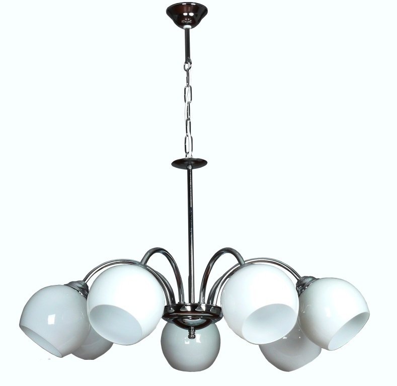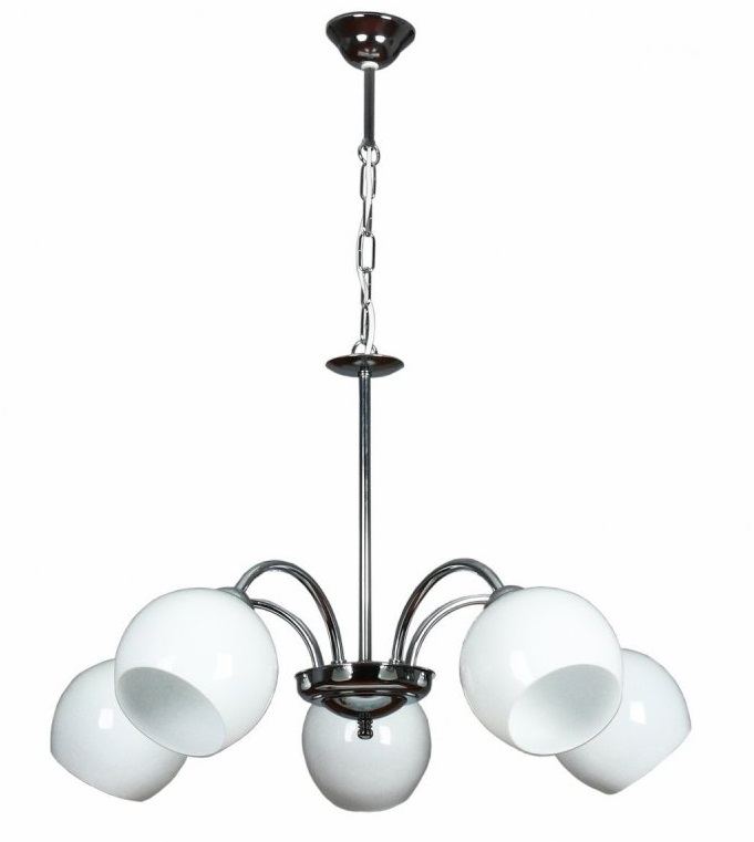 Modell Crocus 10097-5L kann eine große Ergänzung zu Ihrem Wohnzimmerdesign mit Stil sein Hi-Tech, Avantgarde und Minimalismus. Die Kosten für dieses Produkt betragen 5600 Rubel. Chrom-Metallbeschläge und fünf weiße Glasschirme - das ist der Kronleuchter von Crocus. Für eine E14-Basis mit 60 Watt werden fünf Standardglühlampen benötigt. Die erforderliche Spannung beträgt 220 Volt.