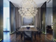 Wenn Sie nach etwas Elegantem und Einzigartigem suchen, um Ihr Interieur und Ihre Beleuchtung zu verbessern, sollten Sie sich die großen Textilkronleuchter wie Organza ansehen. Solche Optionen sehen ziemlich einfach und luftig aus, sie können in der Halle oder im Essbereich über dem Tisch platziert werden.