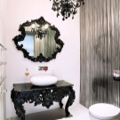 Das Glas selbst sieht jedoch organisch schwarz aus. Achten Sie auch auf Kristall Armaturen. Trotz der Tatsache, dass die Produkte mit Kristall für ein modernes Interieur zu luxuriös erscheinen, passen sie perfekt dazu.