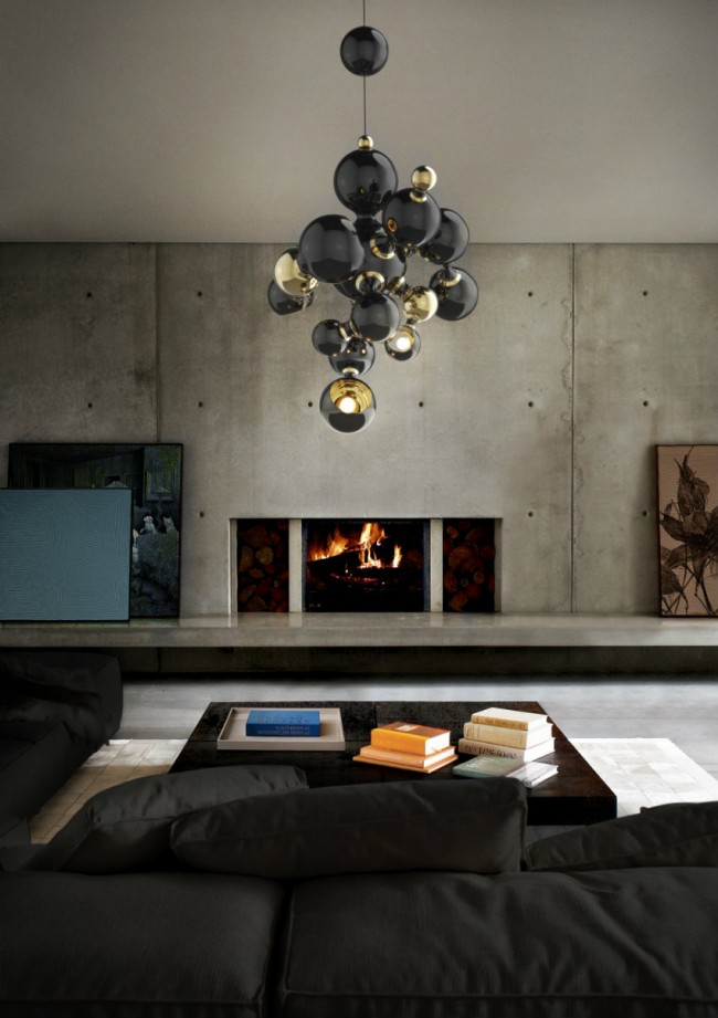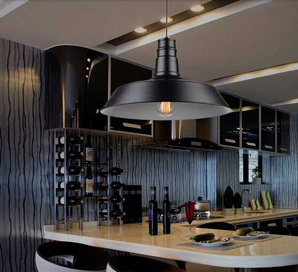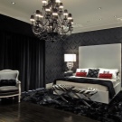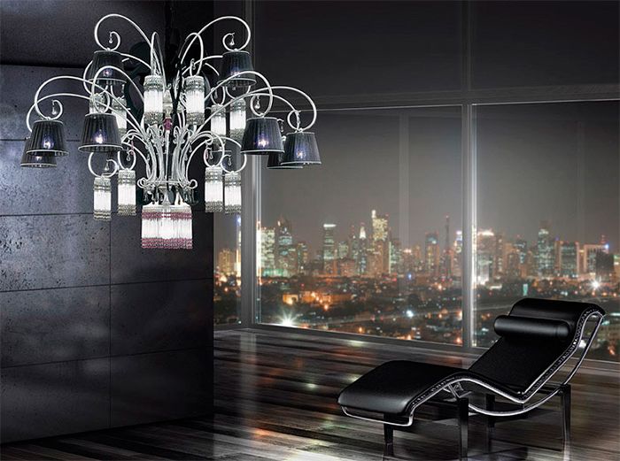 - Deckenleuchter in dieser Farbe sehen sehr beeindruckend aus. Außerdem sehen diese Lampen aus unterschiedlichen Materialien immer anders aus. So verleiht zum Beispiel schwarzer Kristall oder farbiges Glas dem Raum einen Hauch von Luxus, und dunkles Metall deutet auf die Strenge und Modernität des Interieurs hin.