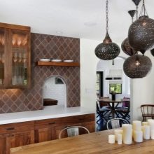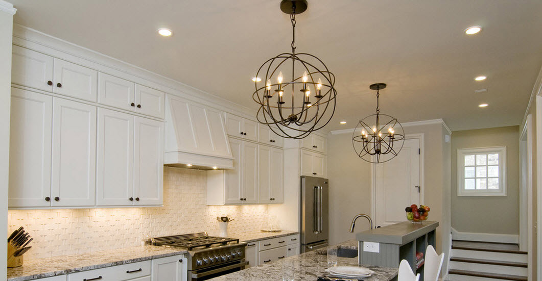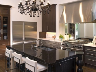 - In der Küche. Überraschend organisch hängenden Kronleuchter sieht in der Küche, vor allem, wenn seine Basis aus robustem Metall ist. Brilliantes Chrom lässt sich am besten mit Haushaltsgeräten kombinieren, wenn es auch in dunklen Farben gemacht wird.