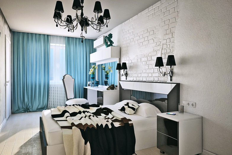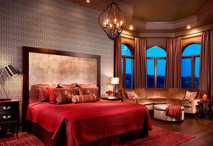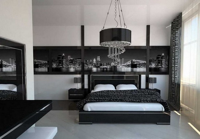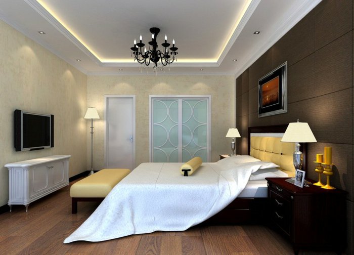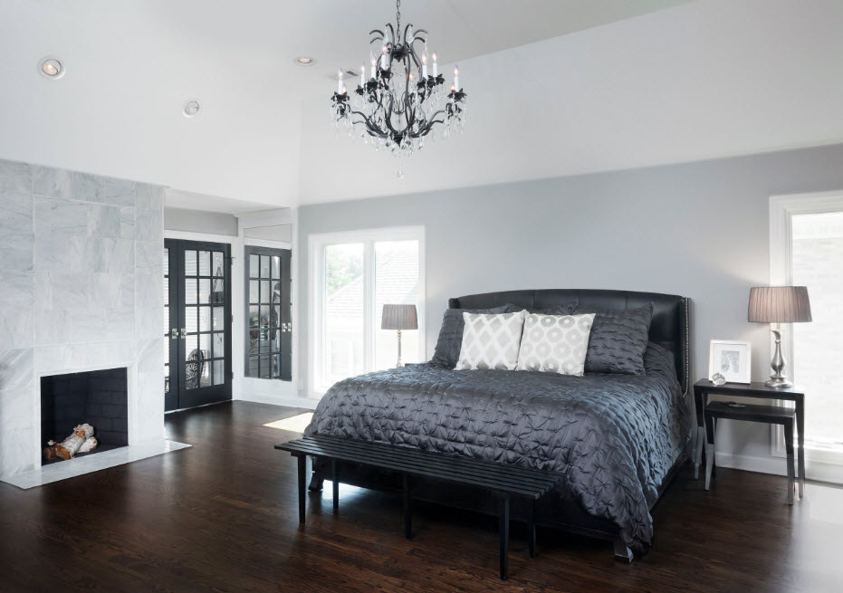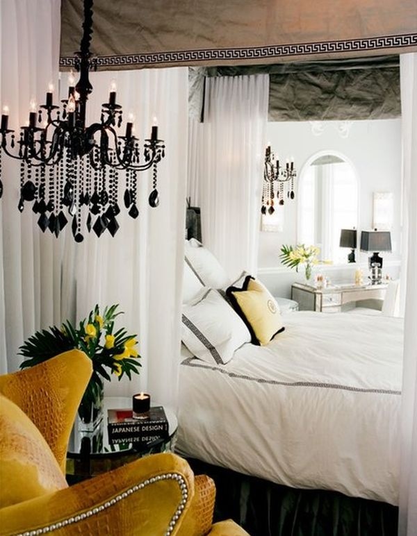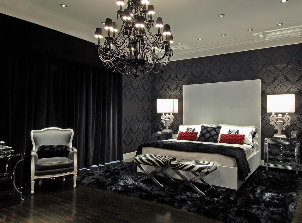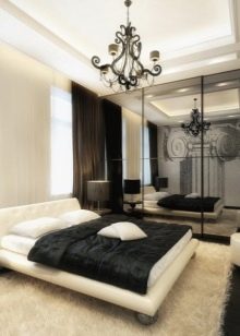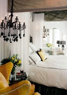 - Im Schlafzimmer. Ein Kronleuchter mit einem spektakulären schmiedeeisernen Rahmen wird im Schlafzimmer sowohl des Mädchens als auch des jungen Mannes sehr stilvoll aussehen. Die schwarze Lampe zieht viel Aufmerksamkeit auf sich, daher sollte der Innenraum insgesamt leichter sein.