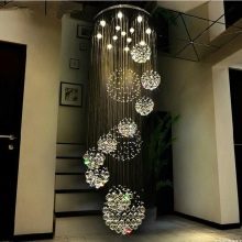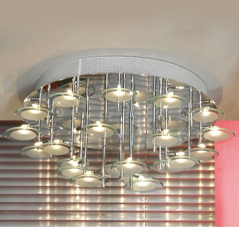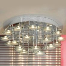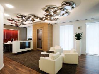 Um dies zu tun, müssen Sie mehrere kleine Kronleuchter mit einer gespiegelten oder verchromten Oberfläche kaufen. Mit Hilfe solcher Geräte können Sie den Raum visuell vergrößern oder verkleinern, den gesamten Bereich oder einen bestimmten Teil davon auswählen. Ein solches System ist universell und passt zu fast jedem Einrichtungsstil.
