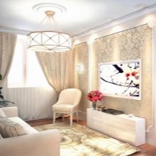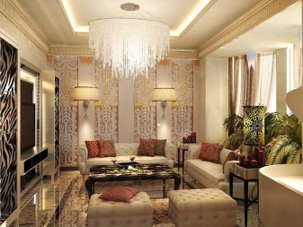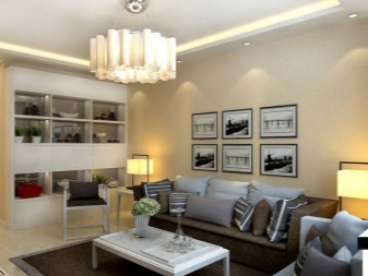 Für ein kleines Wohnzimmer mit niedrigen Decken geeignet Deckenleuchter mit kleinen Schattierungen und Dekor. In diesem Fall ist es angebracht, Lampen der ursprünglichen Form und Farbe zu betrachten. Wenn das Wohnzimmer verlängert wird, müssen mehrere Beleuchtungskörper gekauft werden. Zur vollständigen Ausleuchtung des Raumes sind mindestens zwei Geräte notwendig. Es kann ein Kronleuchter und eine Lampe sein, zwei Kronleuchter (von gleicher oder unterschiedlicher Größe).