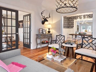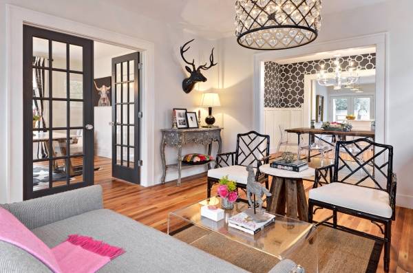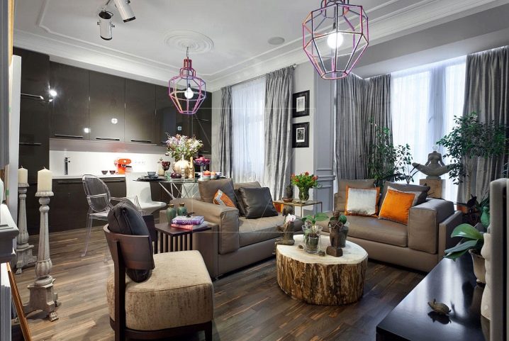 Die zunehmende Popularität wird durch die Gestaltung des Wohnzimmers in einem eklektischen Stil gewonnen. Es ist eine Art "Sammelsurium", in dem Objekte aus verschiedenen Teilen der Welt harmonisch gesammelt werden. Kronleuchter ist der letzte Schliff bei der Gestaltung einer solchen Halle, und wenn es hell und gesättigt auf die Details, dann sollte die Beleuchtung in zurückhaltenden Farben gewählt werden. Wenn es sich im Gegenteil lohnt, sich für einen Kronleuchter einer ungewöhnlichen Form oder Farbe zu entscheiden.