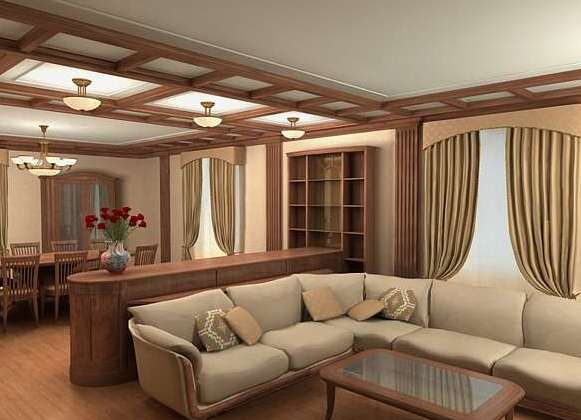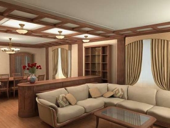 Die Fläche des Wohnzimmers ist ein wichtiger Faktor bei der Wahl eines Kronleuchters. Für einen großen Raum mit hohen Decken sind hängende Kronleuchter mit großen Schatten und massiven Elementen notwendig. Für solche Räume eignen sich je nach Stil geeignete Schmiedeprodukte oder großformatige Kristallkronleuchter aus Holz.Diese Geräte werden in der Lage sein, den gesamten Raum deutlich zu beleuchten und das Hauptelement des Dekors zu werden.