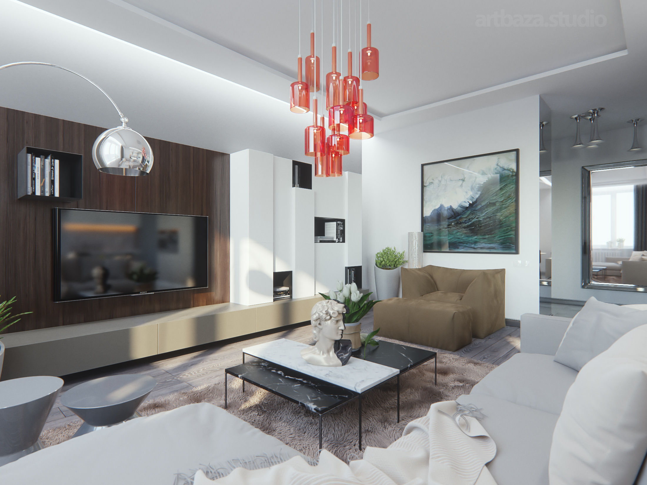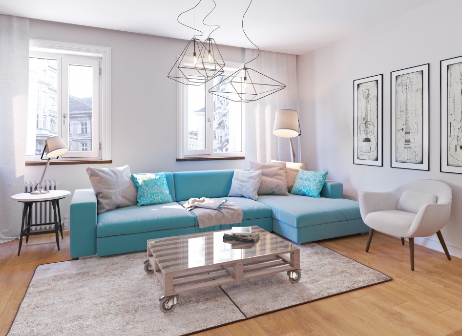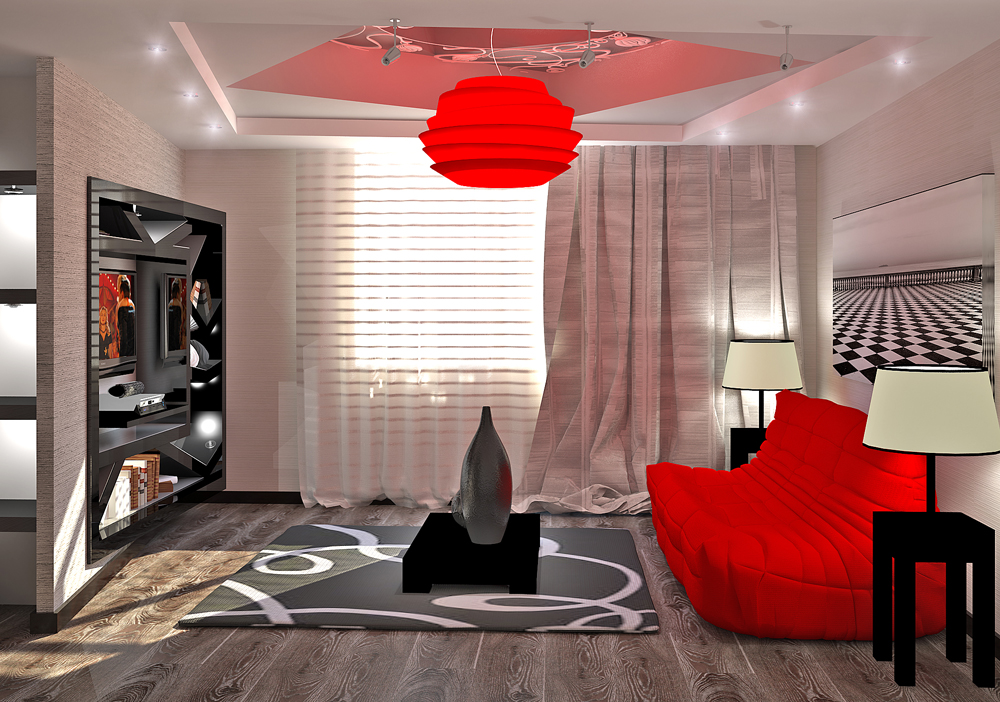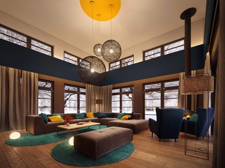 - Die Fülle der Farben. Für ein modernes Wohnzimmer ist es möglich, Lampen nicht nur in einem Standardgelb, sondern auch in Blau, Rot und anderen Farbtönen aufzunehmen;