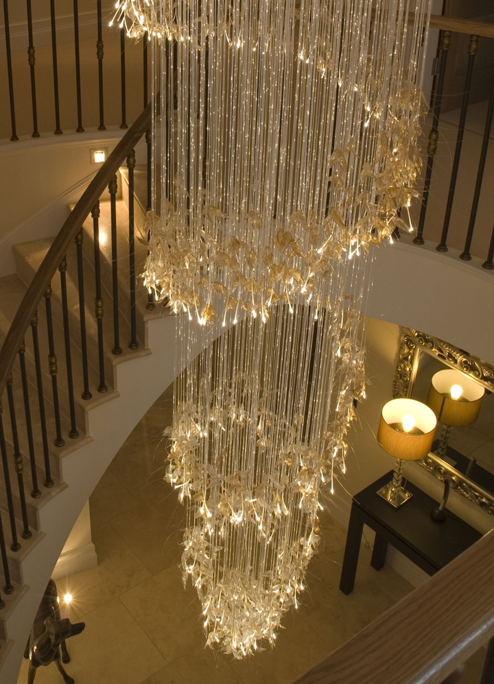 Am Ende der Faser sind kleine Kristalle. Dank ihnen erhält die Lampe eine Vielzahl von Beleuchtungslösungen. Dieser Entwurf sieht majestätisch, aber romantisch aus. Je nach Raumgröße versuchen die Besitzer, die Größe des Geräts so zu wählen, dass alle Teile des Raumes vollständig ausgeleuchtet werden können. Da der technische Fortschritt nicht stillsteht, haben die Designer ein einzigartiges Lichtsystem geschaffen - die Fragmentierung von Lichtströmen.