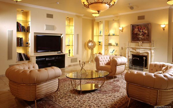 Von dem dominierenden Schatten im Wohnzimmer hängt die Farbe der Beleuchtung ab. Wenn der Raum auf einem warmen, ruhigen, neutralen Ton basiert, sollte die Beleuchtung in der traditionellen gelben, roten, orange Farbe gewählt werden.Es kann sowohl in einer Glühbirne als auch in dekorativen Elementen vorkommen.