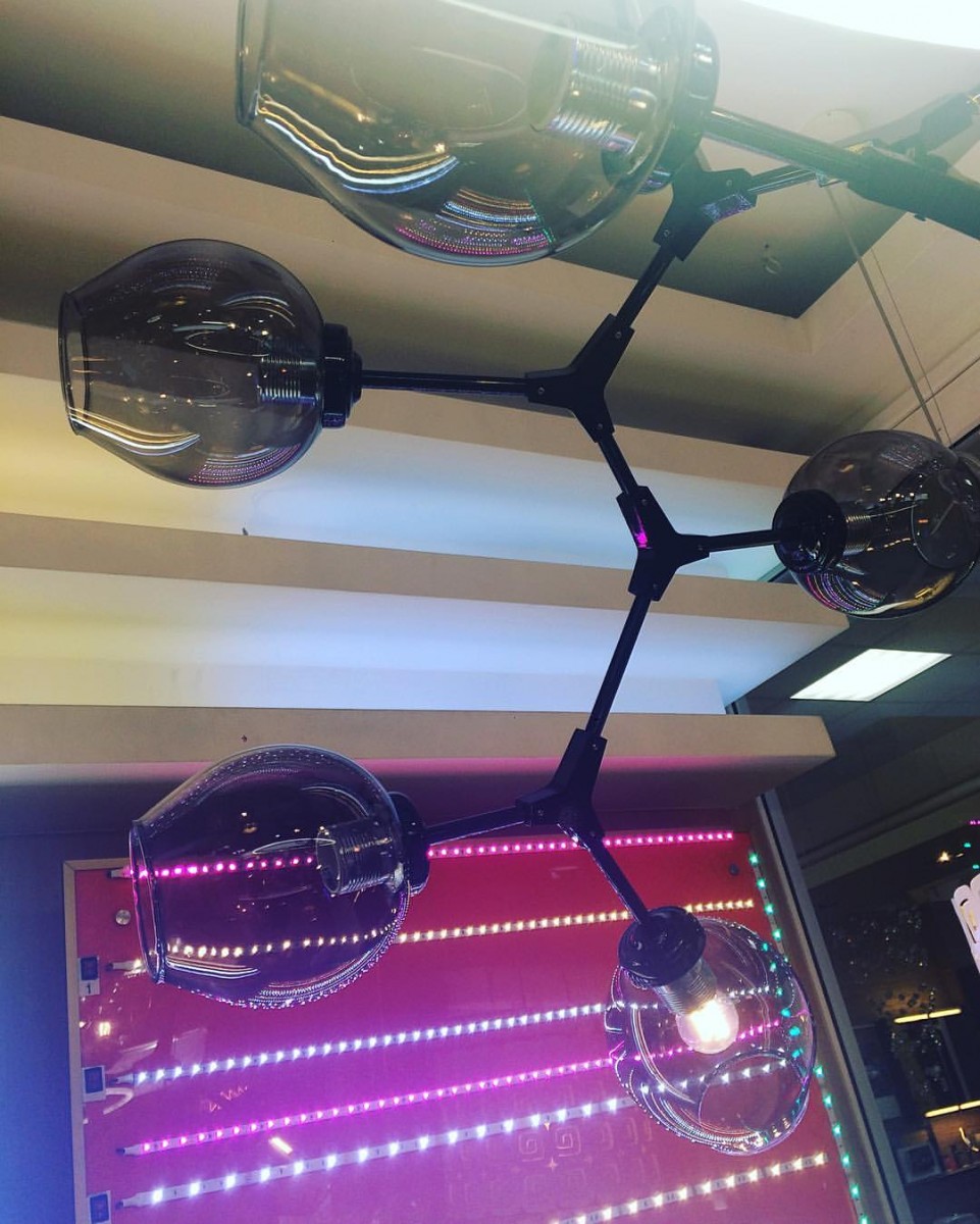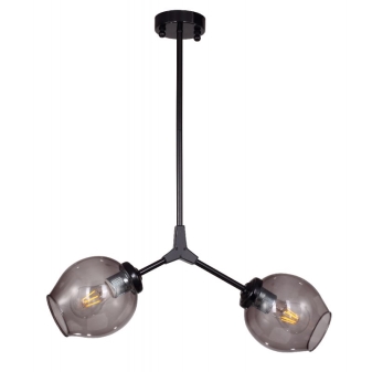 Die Leuchte des Kronleuchters ist ein schwarzes Metall, zwei Lampenschirme sind aus grauem Glas. Solche Produkte sind bei Verbrauchern sehr beliebt.
