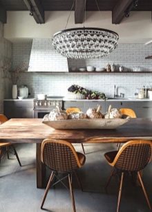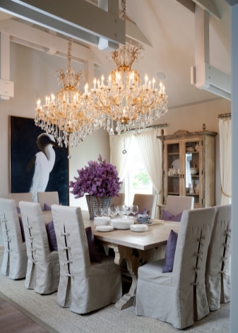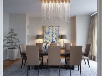 Bei der Auswahl eines Kronleuchters ist es auch eine Überlegung wert, dass Sie mit seiner Hilfe die Proportionen des Raumes visuell korrigieren können. Wenn Sie einen Raum "ausstrecken" möchten, sollten Sie einen horizontal gestreckten Kronleuchter bevorzugen. Die hängenden Elemente der Lampe verringern visuell die Höhe der Decke.