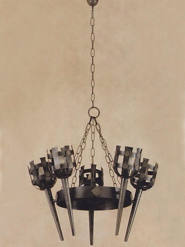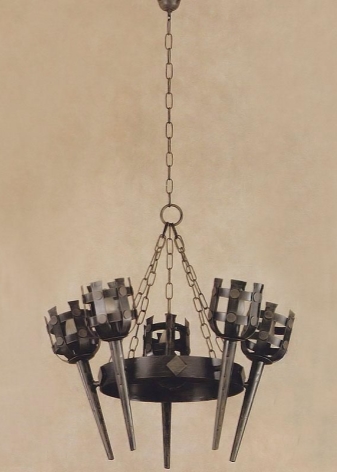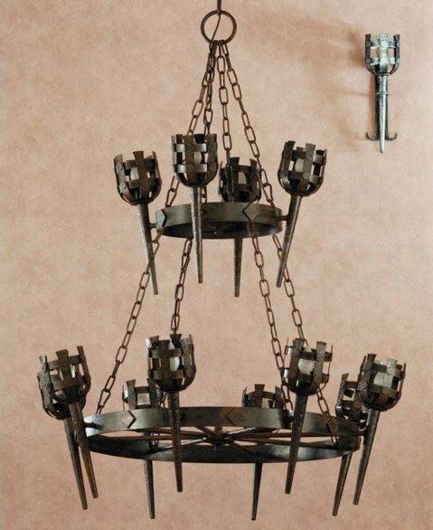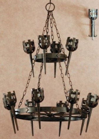 - "Terra". Geschmiedeter Kronleuchter im mittelalterlichen Stil. Sein Design ahmt Fackeln nach, die die Ritterburgen jener Zeit beleuchten. Deckenleuchten können in einer oder mehreren Reihen sein, was es Ihnen ermöglicht, diesen Kronleuchter in verschiedenen Volumen zu wählen.
