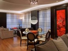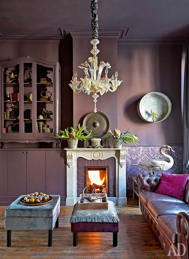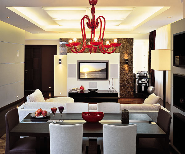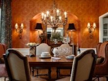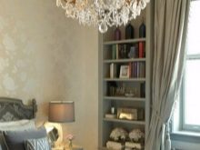 - Sehr hübsch,Textile dunkle Töne in Kombination mit einem Kristallleuchter eines roten Farbtons werden ungewöhnlich und originell aussehen. Eine Schreibtischlampe mit warmem Schein kann diese Komposition ergänzen.