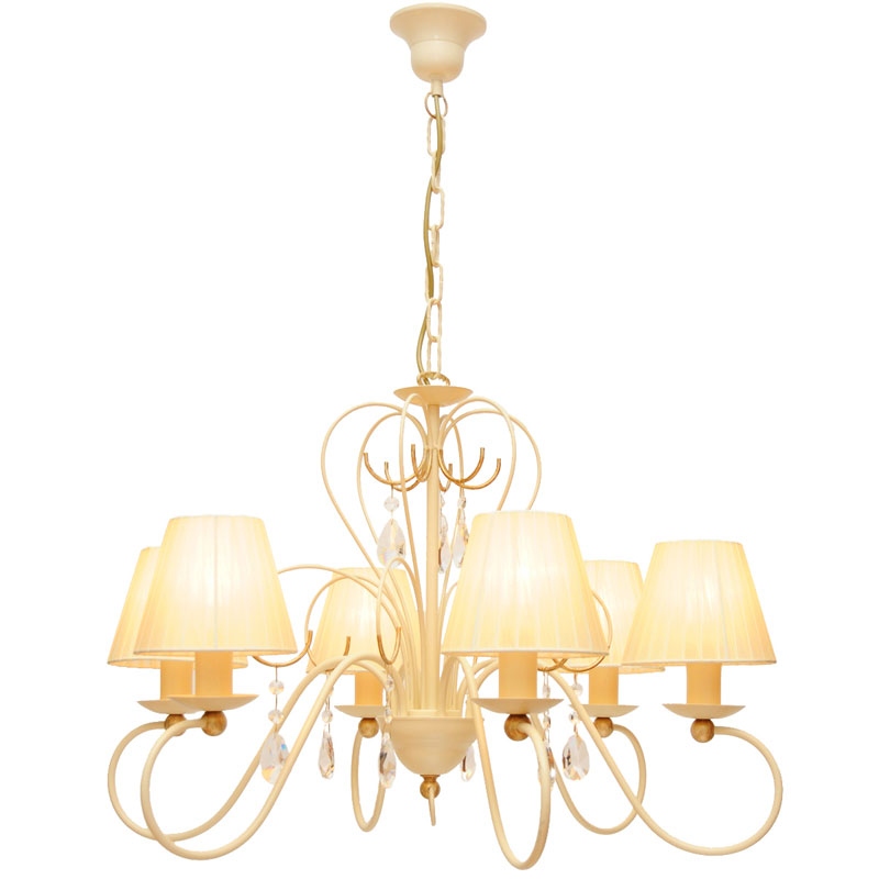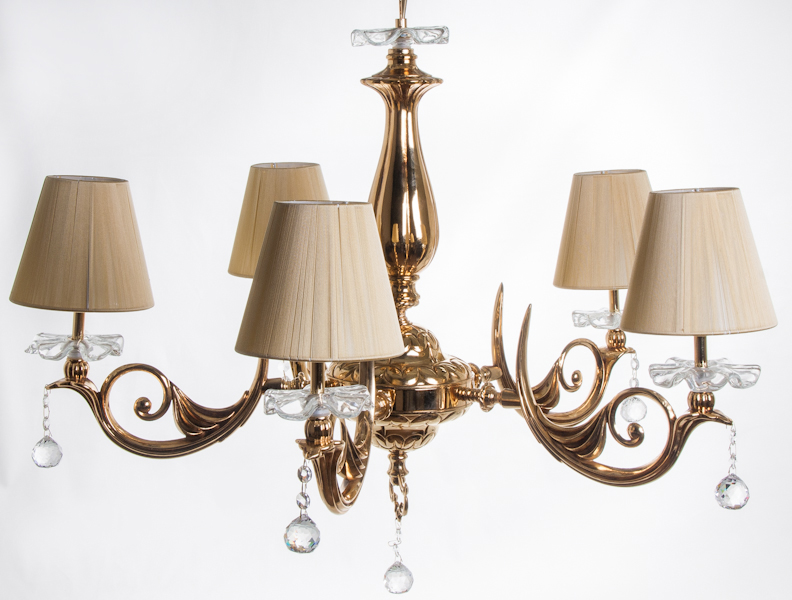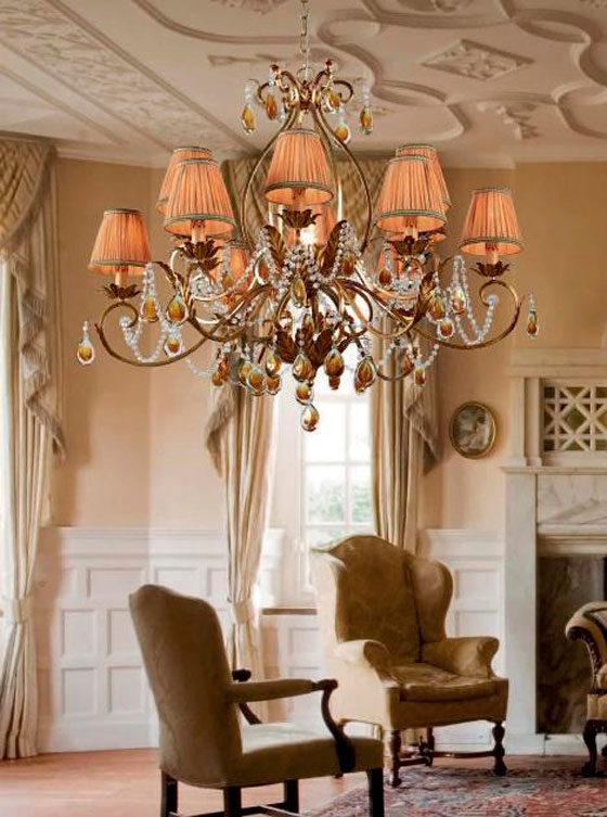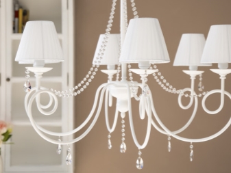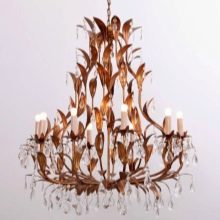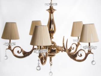 Armatur wird normalerweise der ganze Kronleuchter gemacht. Er bestimmt den Stil des Produkts, sein Design, es ist oft in verschiedenen Farben lackiert und mit Accessoires verziert. Aber immer noch setzt der Stil des Produkts in der Regel ein Lampenschirm. Es besteht normalerweise aus Stoff, manchmal aber auch aus Metall (wie oben ausführlich beschrieben).