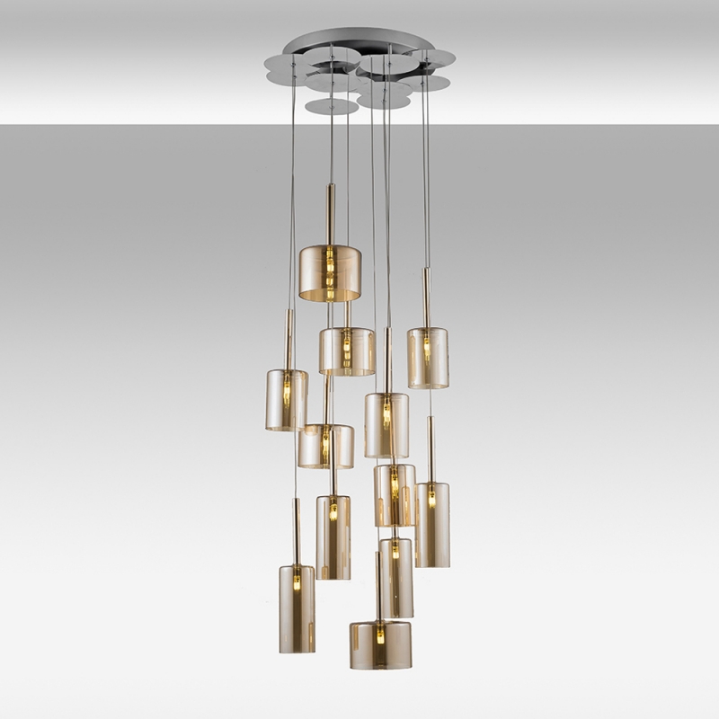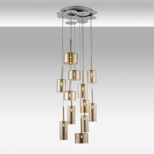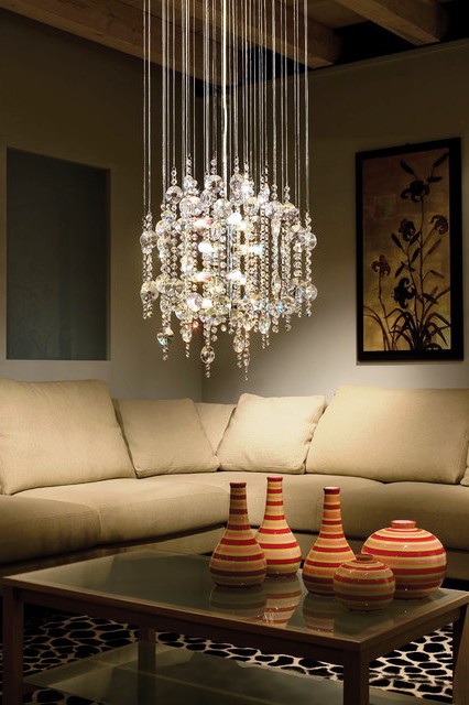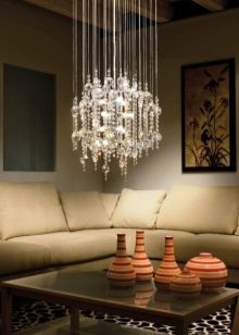 Mit Hilfe von abgehängten Deckenlüstern ist es außerdem möglich, die größten Räume aufgrund der Streuwirkung zu beleuchten. Das Design einer solchen Vorrichtung besteht üblicherweise aus drei oder mehr Glühbirnen mit einer Leistung von jeweils etwa 300 Watt.