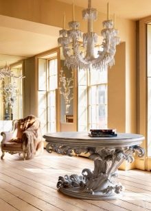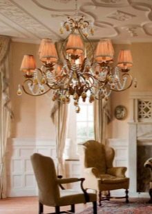 Der Kronleuchter sollte je nach Farbe und Stil des Innenraums gewählt werden. Für den Innenraum im klassischen Stil wäre eine traditionelle neutrale Lampe in den Farben Weiß, Grau und Beige die beste Lösung. Auch solche Schattierungen wie transparent-weiß, Creme, Bronze, Braun, und auch Farben von Gold und Silber, Wenge wird gut aussehen.