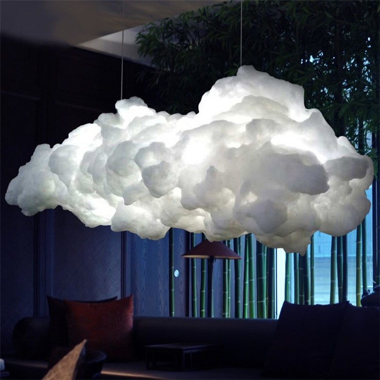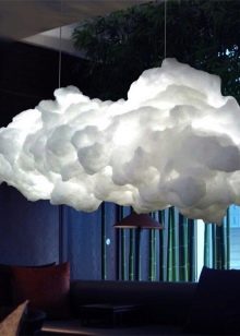 Und schließlich wird eine der kreativsten Lösungen genannt Wolke. Es wird meistens von Hand mit Watte, einem Lampenschirm und einer Klebepistole gemacht. Eine Menge Baumwolle wird auf den Lampenschirm geklebt, wodurch eine Wolkenform entsteht, dann wird die Lampe innen platziert (vorzugsweise blau).Es stellt sich heraus, sehr originelle und einzigartige Lampe.