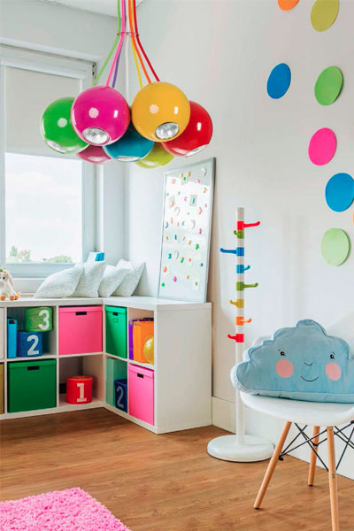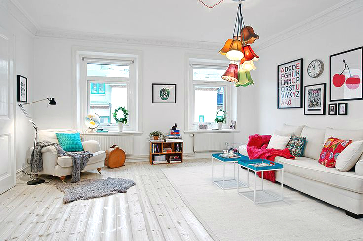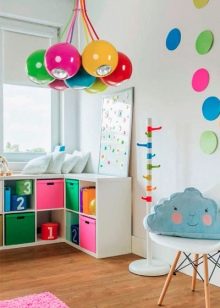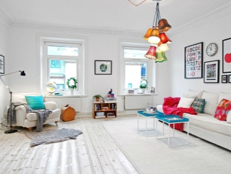 - Für ein komplett weißes minimalistisches Zimmer wird ein Design mit vielen bunten Lampenschirmen: Orange, Rot, Grün eine tolle Dekoration sein. Alle Regenbogenfarben sind besonders dann geeignet, wenn Sie sie mit den gleichen Kissen oder zum Beispiel Patchwork-Teppich kombinieren.