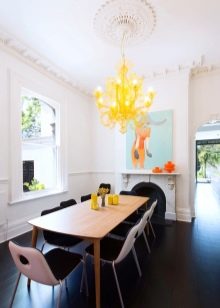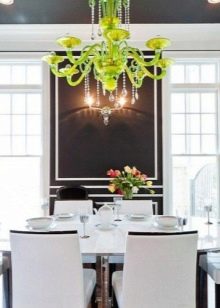 Ein grüner Kronleuchter verleiht dem Raum Luxus und Eleganz. Aber es ist nicht mit allen Farben von Tapeten und Einrichtungsgegenständen kombiniert, also sei vorsichtig mit ihm. Der Gelbstich ist am wenigsten verbreitet: alles wegen seiner Inexpressivität. In manchen Fällen kann es aber auch gut aussehen.