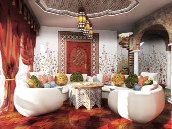 - Spezielle türkische Kronleuchter mit Mustern und geschlossenen Schatten passen in das Wohnzimmer im türkischen Stil. All dieses Interieur kann mit einer Vielzahl von weichen Kissen mit einem ähnlichen Muster ergänzt werden.