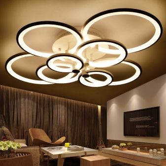 Sehr origineller und ungewöhnlicher Look wird genannt "Ring": Er hat natürlich seinen Namen dank der Form bekommen. Dies ist eine moderne Konstruktion, die aus einem, zwei oder drei Ringen besteht, in denen Beleuchtungseinrichtungen installiert sind. Sie sind entweder genau hintereinander oder ineinander verschlungene Kreise. Sie können mit verschiedenen dekorativen Steinen verziert und in einer Vielzahl von Farben bemalt werden, aber meistens ist es Gold und Silber. Diese Art von Kronleuchter wird dem Wohnzimmer oder Schlafzimmer außergewöhnlichen Charme verleihen und wird sehr teuer und luxuriös aussehen.