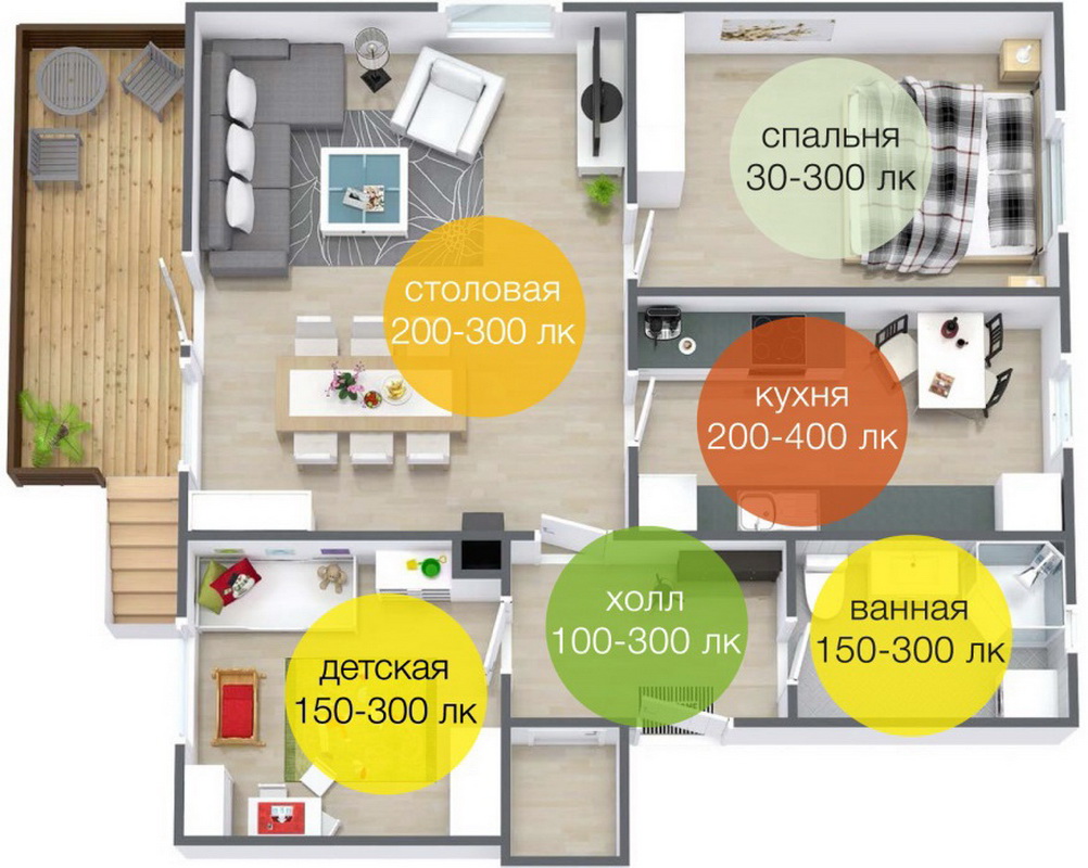 EEs gibt bestimmte Standards für die Beleuchtung im Raum. Sie sind für eine gewöhnliche Glühlampe konzipiert, lassen sich jedoch unter Berücksichtigung des Korrekturfaktors leicht in energiesparende Lichtquellen umwandeln. Auf 1 Quadrat. ein Raummeter, der helles Licht benötigt (Küche, Wohnzimmer), benötigt mindestens 20 Watt. Für Räume mit mittlerer Beleuchtung (Badezimmer, Kinder) - 18 W pro 1 Quadrat. Der Raum mit gedämpftem Licht (Schlafzimmer) benötigt etwa 12 Watt pro Quadratmeter. m