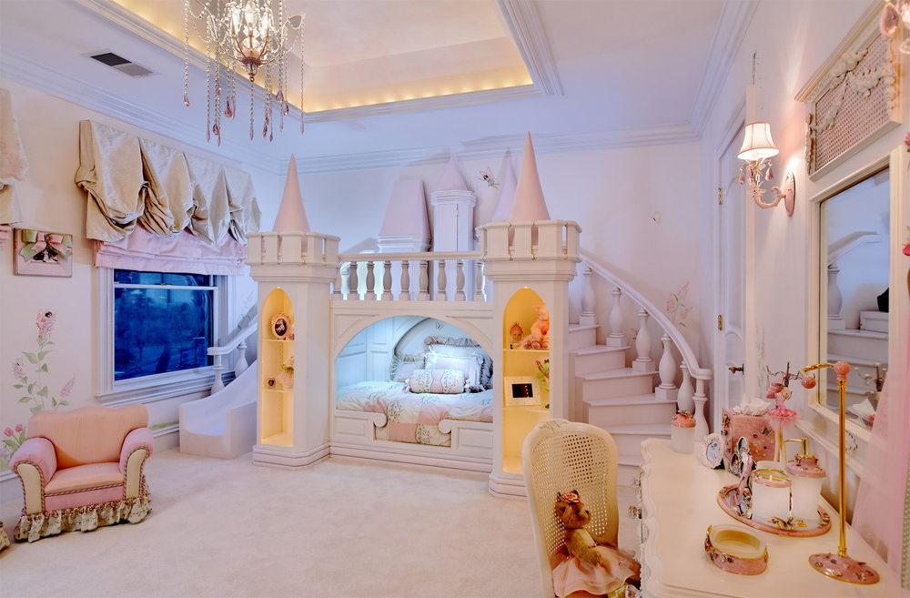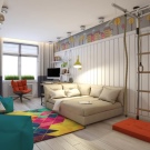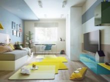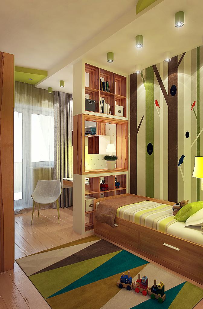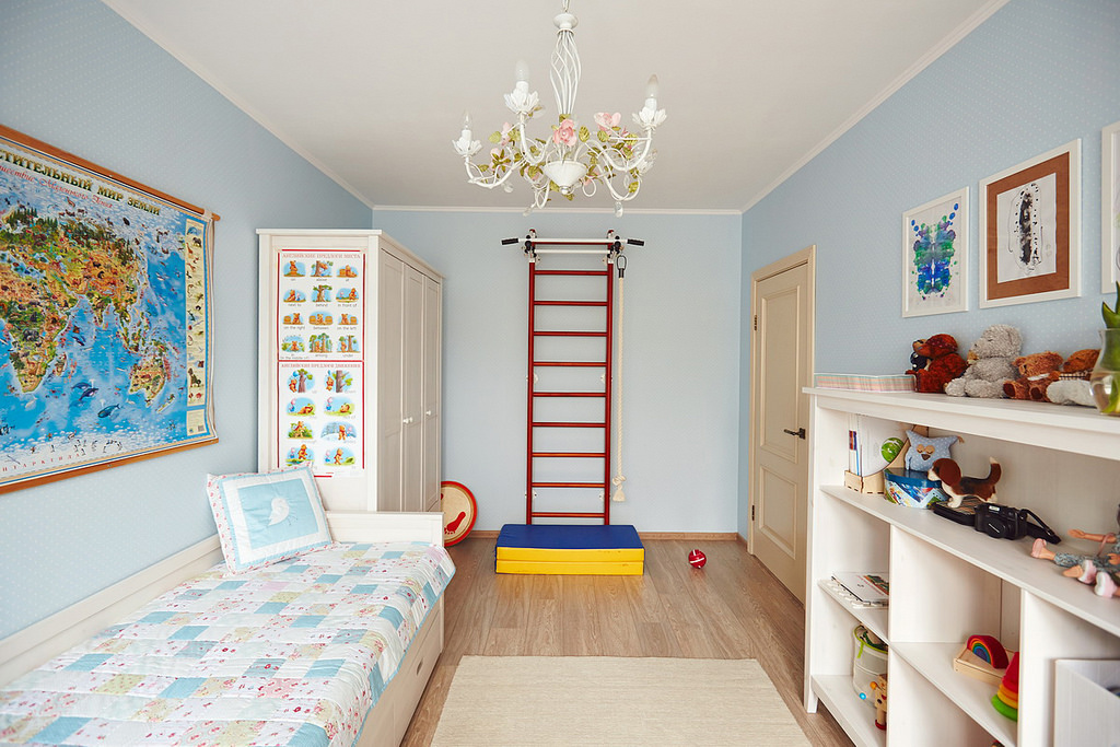 Es ist nicht notwendig, nur den Kronleuchter zu benutzen. Eine interessante und funktionelle Lösung wird die Spotbeleuchtung sein. Außerdem wird es helfen, den Raum in Zonen einzuteilen: arbeiten, schlafen und spielen.