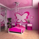 In den Schlafzimmern für Mädchen ist es beliebt, hängende lange Modelle aus verschiedenen Objekten zu verwenden.In diesem Fall besteht der Kronleuchter aus schönen bunten Glasstücken, die in einer bestimmten Reihenfolge aufgehängt sind. Trotz der Tatsache, dass der Kronleuchter ziemlich lang ist, ist es außerhalb der Reichweite des Vorschülermädchens.