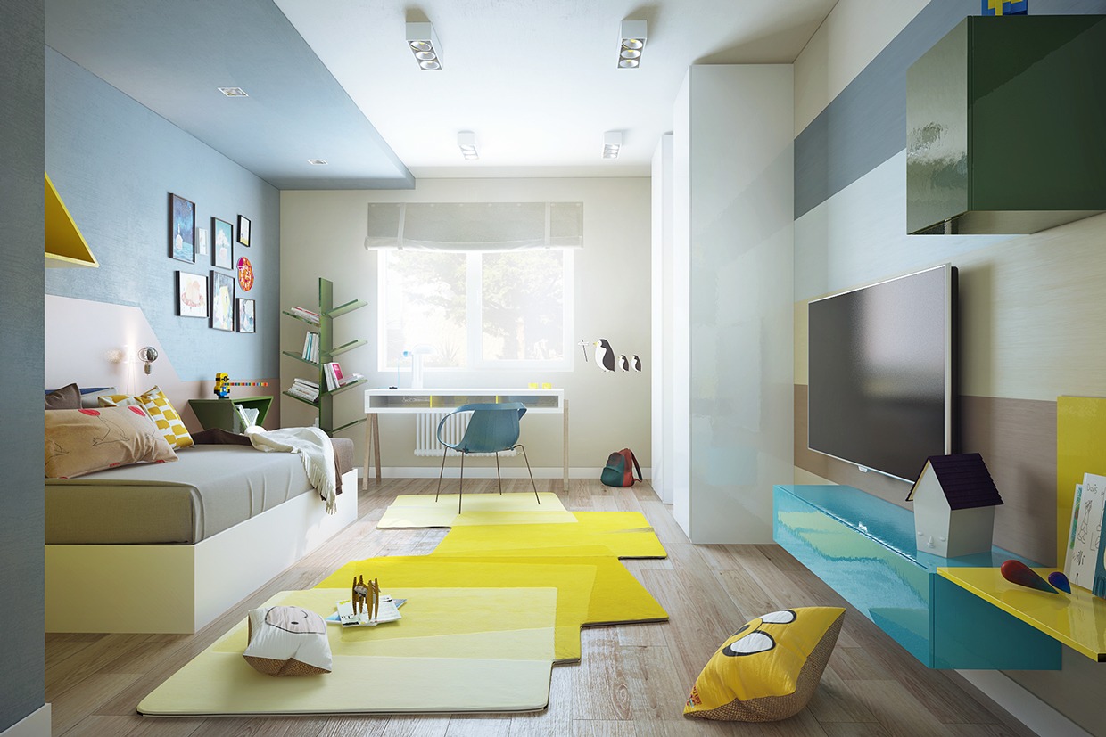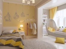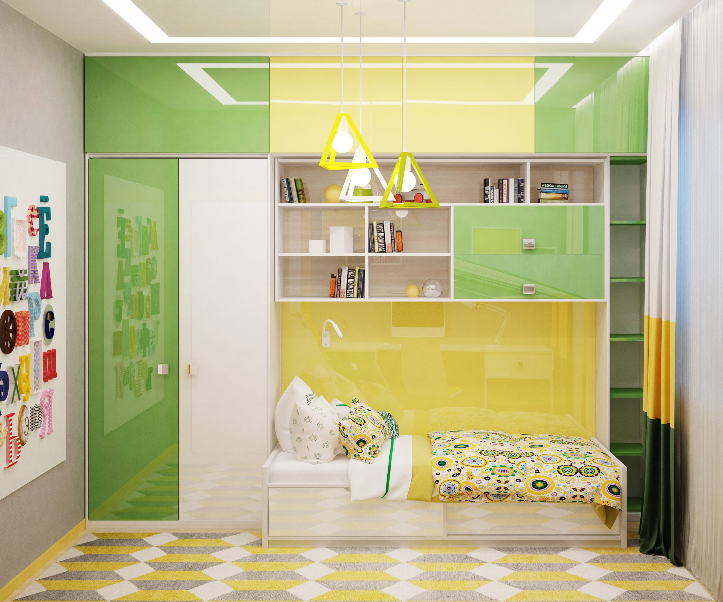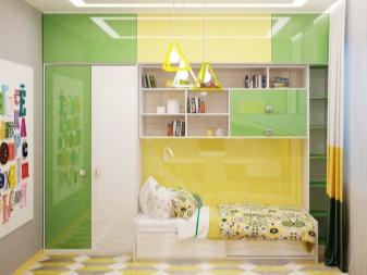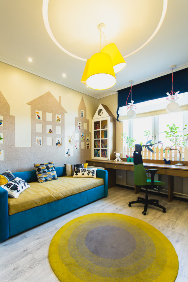 Ein paar helle Deckenlampen sind eine beliebte Lösung für das Schlafzimmer eines Schulkindes. Sie können in der Adoleszenz verwendet werden, die bunte gelbe Farbe erlaubt es dem Kind nicht, sich in einem solchen Raum zu langweilen. Der Kronleuchter schafft kein ausreichendes Beleuchtungsniveau und wurde daher mit einem Strahler und einem LED-Ring ergänzt.