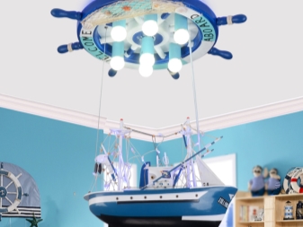 Viele Faktoren beeinflussen das Aussehen des Kronleuchters. Einer von ihnen ist insbesondere die thematische Füllung des Raumes. Wenn Ihr Kind ein Zimmer im Piratenstil einrichten wollte, lohnt es sich nicht, einen Kronleuchter mit einem verdrehten Blumenschirm zu kaufen. Es wäre logischer, ein Modell in Form einer Schriftrolle, eines Piratenschiffes oder eines Cartoonschädels mit einer Binde über einem Auge zu wählen.