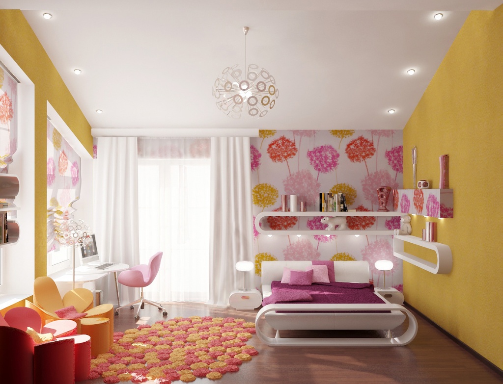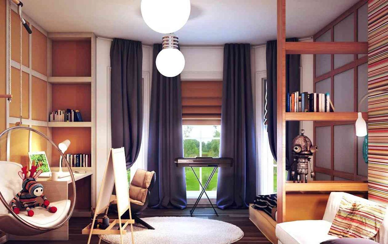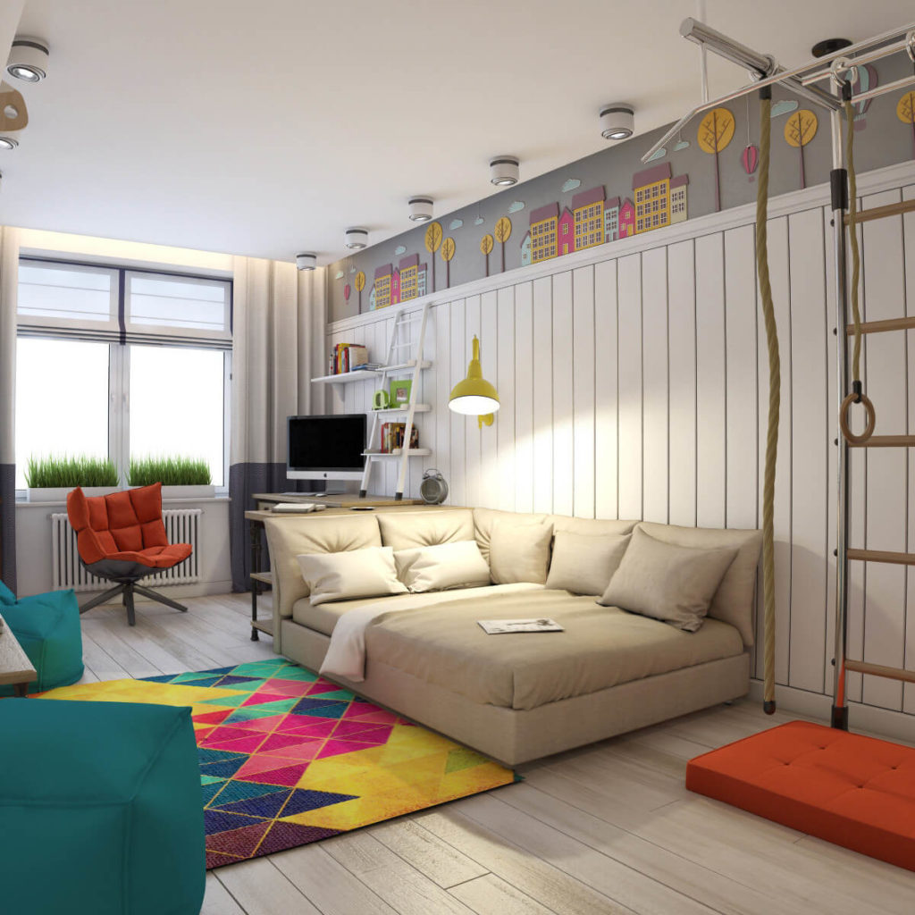 Ungewöhnliche Hängeleuchter in neutralem Weiß eignen sich hervorragend zum Dekorieren eines Jugendzimmers. Es hat eine ziemlich interessante Konstruktion und gleichzeitig hallt es den umgebenden Raum wider. Da der Raum ziemlich groß ist, sieht eine so große Decke nicht allzu hell aus.