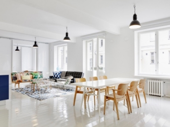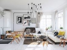Der skandinavische Stil erfordert eine perfekte helle Beleuchtung und ein Gefühl von Raum. Deshalb ist es wichtig, nicht nur das Aussehen, sondern auch die benötigte Anzahl an Beleuchtungsgeräten und deren Standort zu wählen.