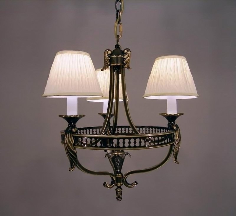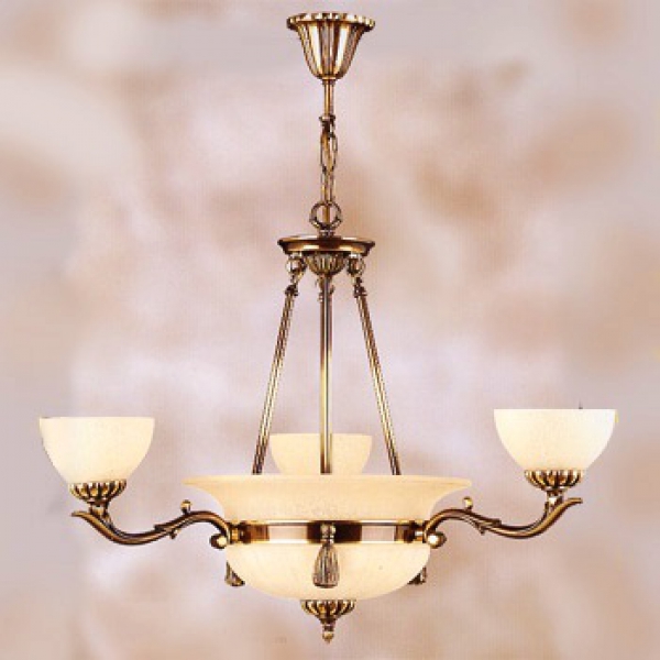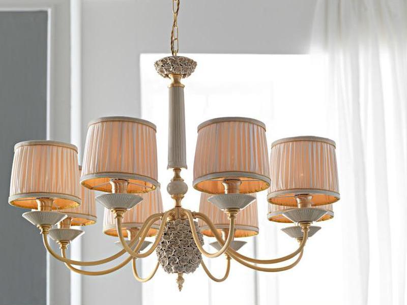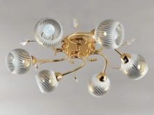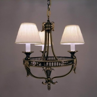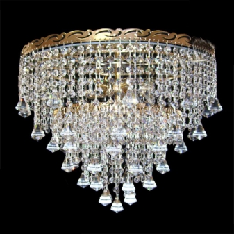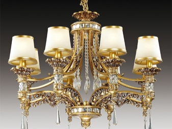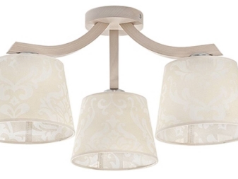- Kronleuchter im klassischen Stil wird durch eine mehrgleisige Hängestruktur mit Stoffmustern dargestellt, die mit Fransen oder Kanten verziert sind. Die Anzahl der Deckenlampen hängt von der Größe des Schlafzimmers ab: Für kleine Räume genügen nur drei, für eindrucksvolle siebenarmige Konstruktionen.