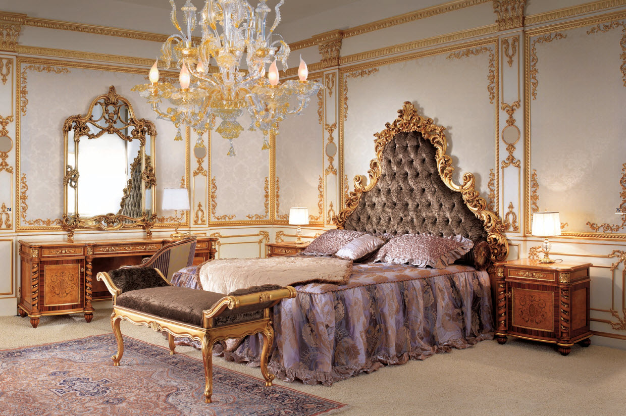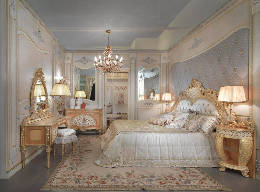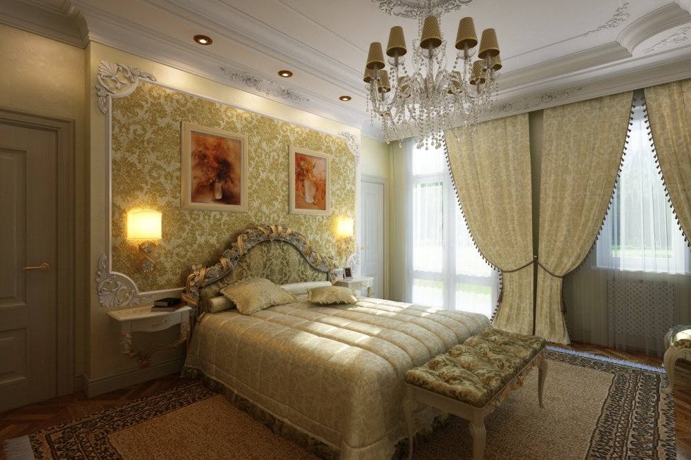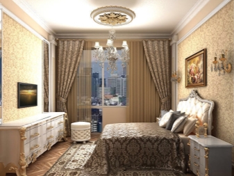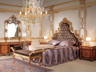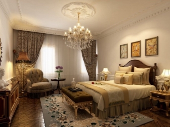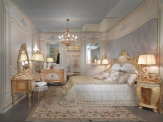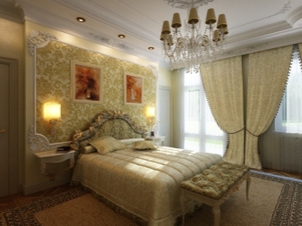 - Für Schlafzimmer Barock Wählen Sie pompöse große Designs mit vielen exquisiten Details. Dazu gehören Kristalllampen und Busch-Kronleuchter. Es ist ratsam, irisierende Beschichtung mit Blattgold zu wählen, sie betonen die Majestät des gesamten Innenraums.