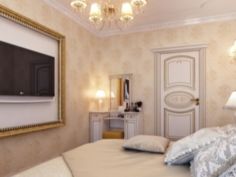 Für den klassischen Stil ist es typisch, Stofftöne von neutralen Tönen auf raffinierten dünnen Basen zu verwenden. In diesem Fall wird die Farbe der Basis im gleichen Farbton wie die Wand gewählt, und die Deckenlampen bestehen aus dem gleichen Material wie die dekorativen Kissenbezüge auf dem Bett.