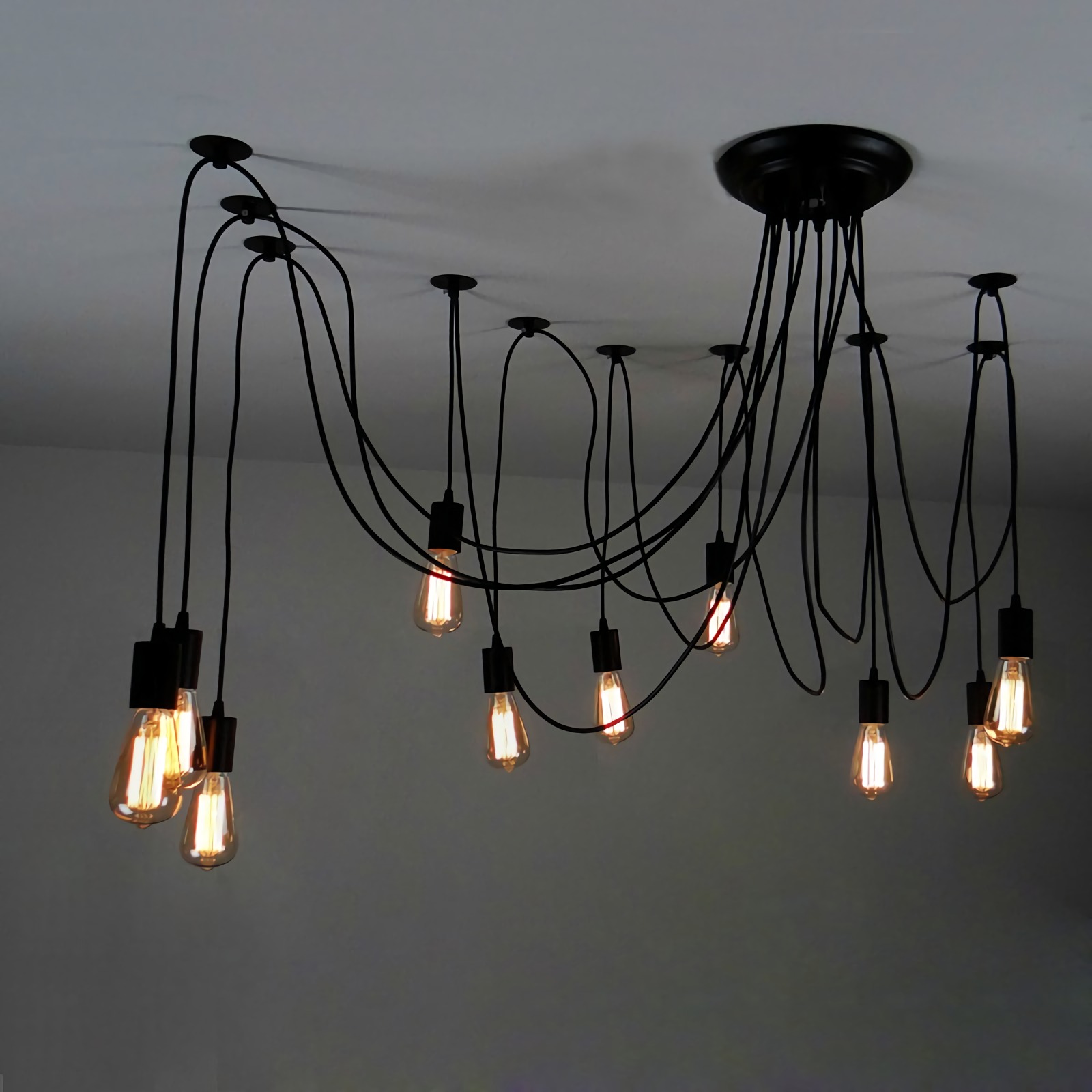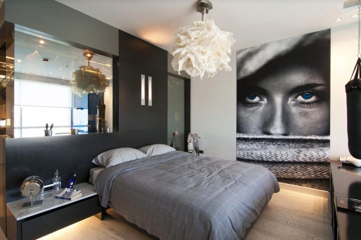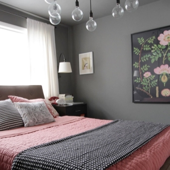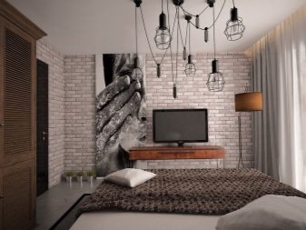 Weicher Kronleuchter "Spinne" für einen kleinen Schlafzimmerstil Loft - Klassiker des Genres. Trotz der geringen Größe des Raumes sieht die Pendelleuchte aufgrund der korrekt gewählten Länge und des Durchmessers der Pickup-Platzierung nicht fehl am Platz.Schwarze Drähte fangen das Auge nicht an der grauen Decke auf, sondern betonen nur die Dramatik des Interieurs.