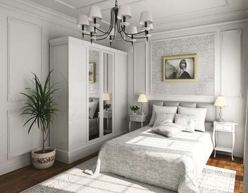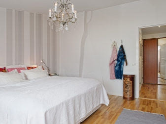 - Für ein kleines Schlafzimmer Bei niedrigen Decken ist der Kronleuchter mit mehreren Balken die beste Wahl. Es nimmt nicht viel Platz ein und beleuchtet perfekt die gesamte Raumfläche, so dass keine zusätzlichen Lampen installiert werden müssen.